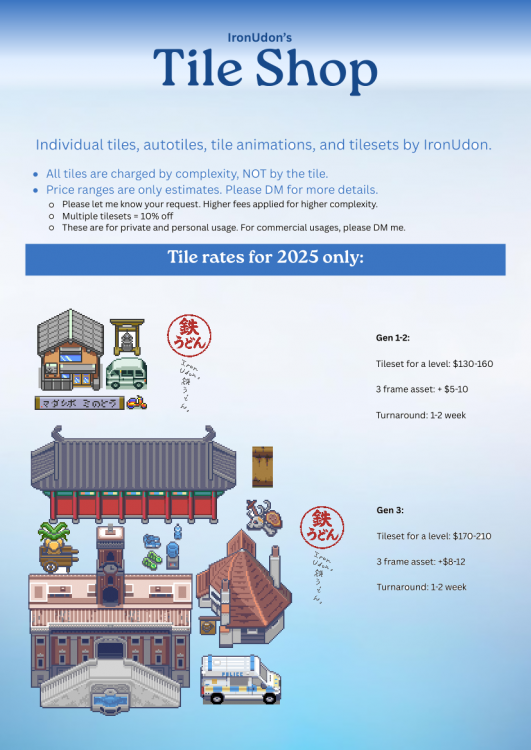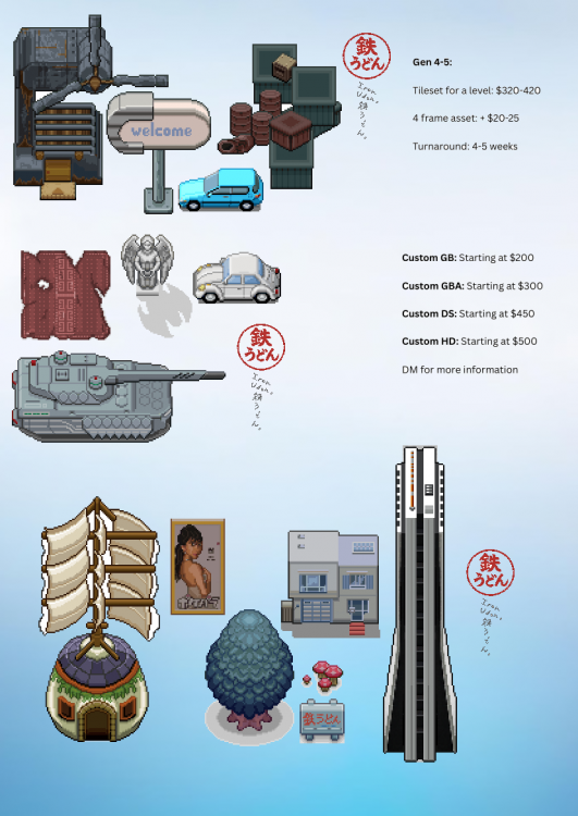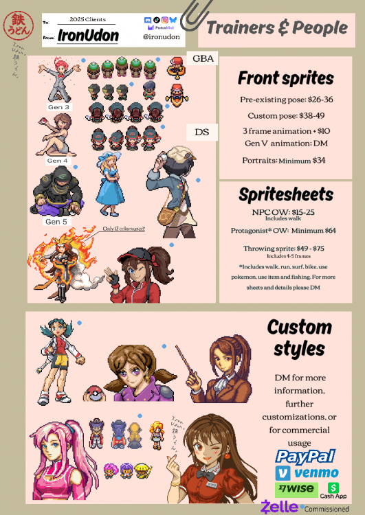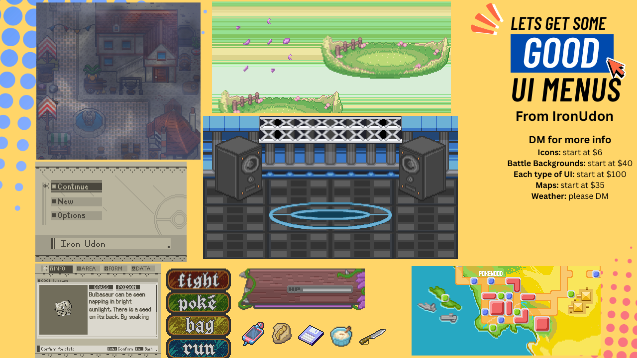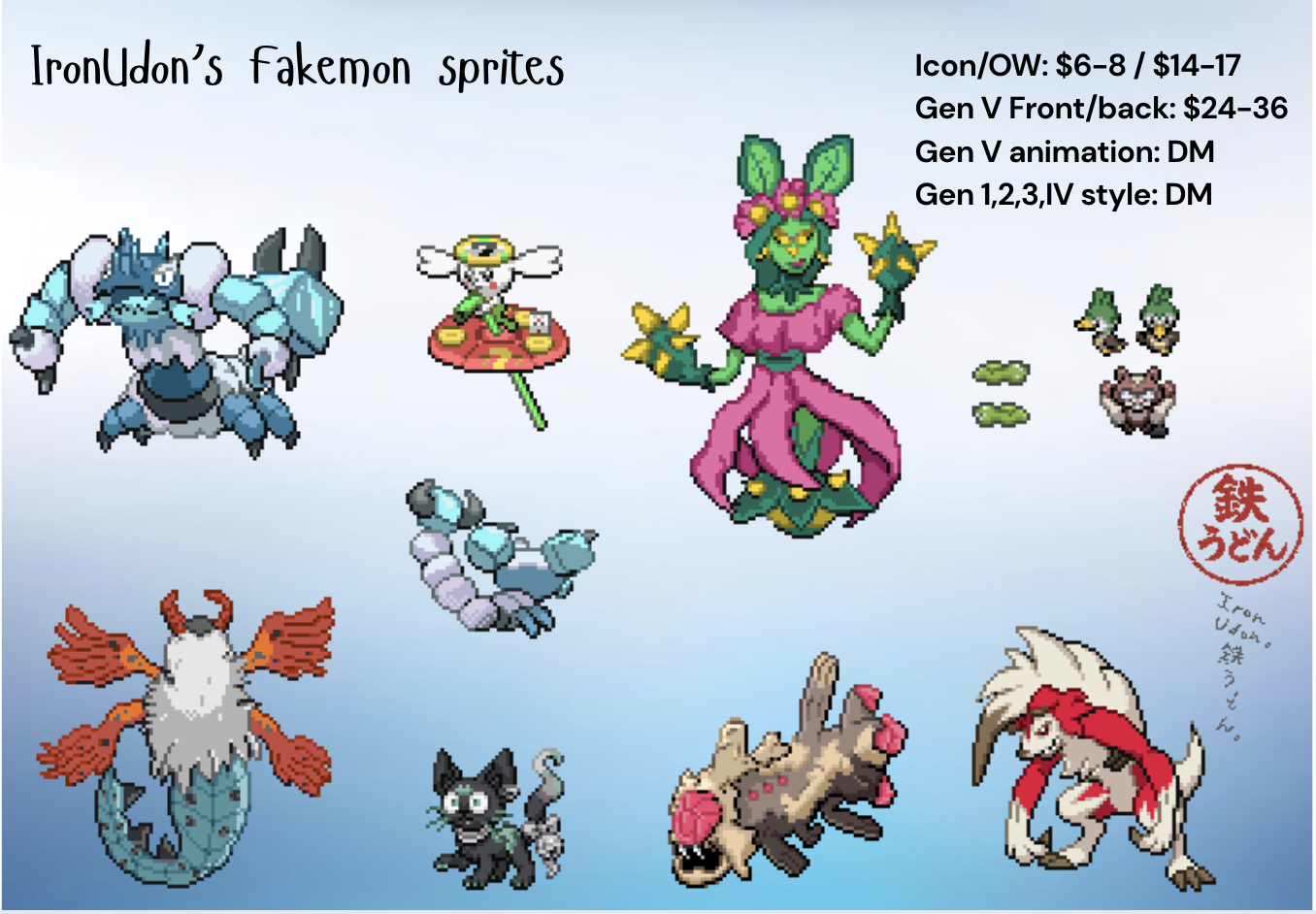 Hi everyone! - I’m a freelance pixel artist specialized in Pokemon sprites, animations, & tilesets. - Rates are rough estimates; please reach out for more details. - Has paid experience making/customizing visual assets for fangames, ROM hacks, and ROM mods. - Can be commissioned to repair or enhance any tile or sprite you give to me. - Primary Contact: Discord: @ironudon Email: ironudon@proton.me Please reach out to me through one of these if interested or have any questions!