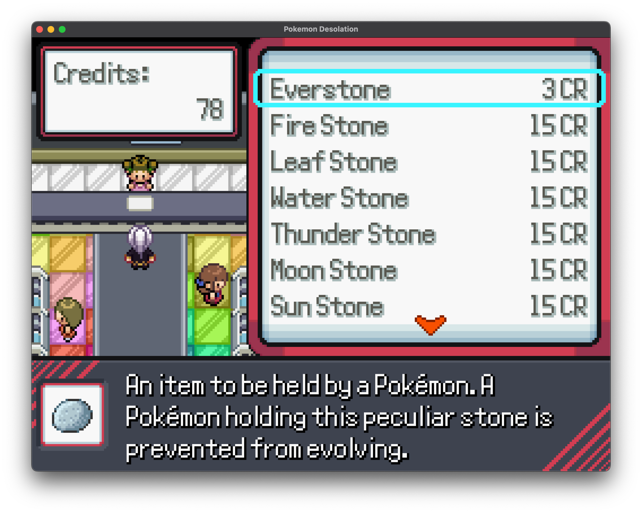 No more long menus for buying evolution stones, Pokemon, or TMs... No more trying to remember which TMs you bought... it's all just regular shop interfaces now!
