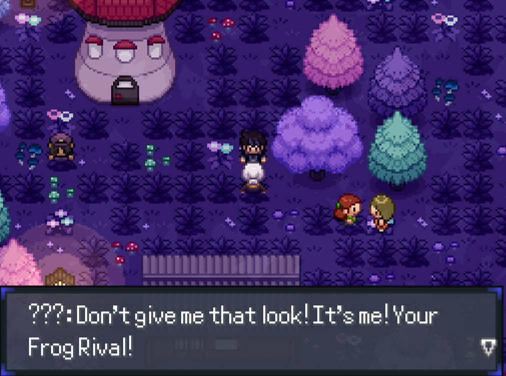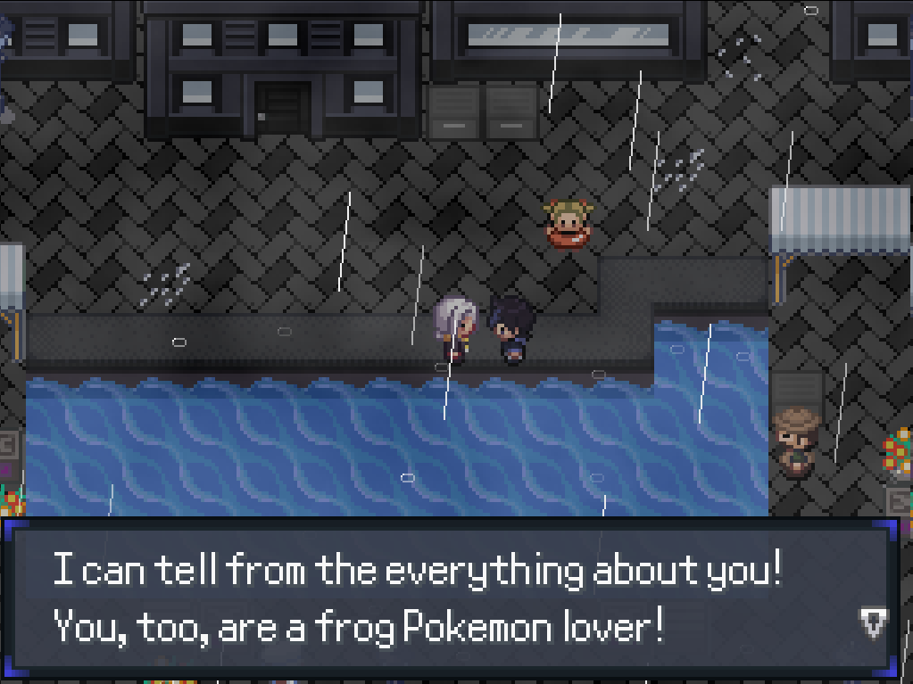 And of course, I love to use sidequests and flavor text to just build out the world. Even if it’s minor, the implication there’s some guy running around Aryith who just… REALLY likes frogs and is going on his own little adventures to find and catch them makes it feel like, y’know, the player isn’t the center of the universe. And it helps that mono-runs that aren’t just about Pokemon type are very common and popular in the Pokemon fan space, so an in-universe character who exclusively uses frogs felt like both a realistic thing to happen, and I felt it would be a nice nod to that type of run in Pokemon circles.
