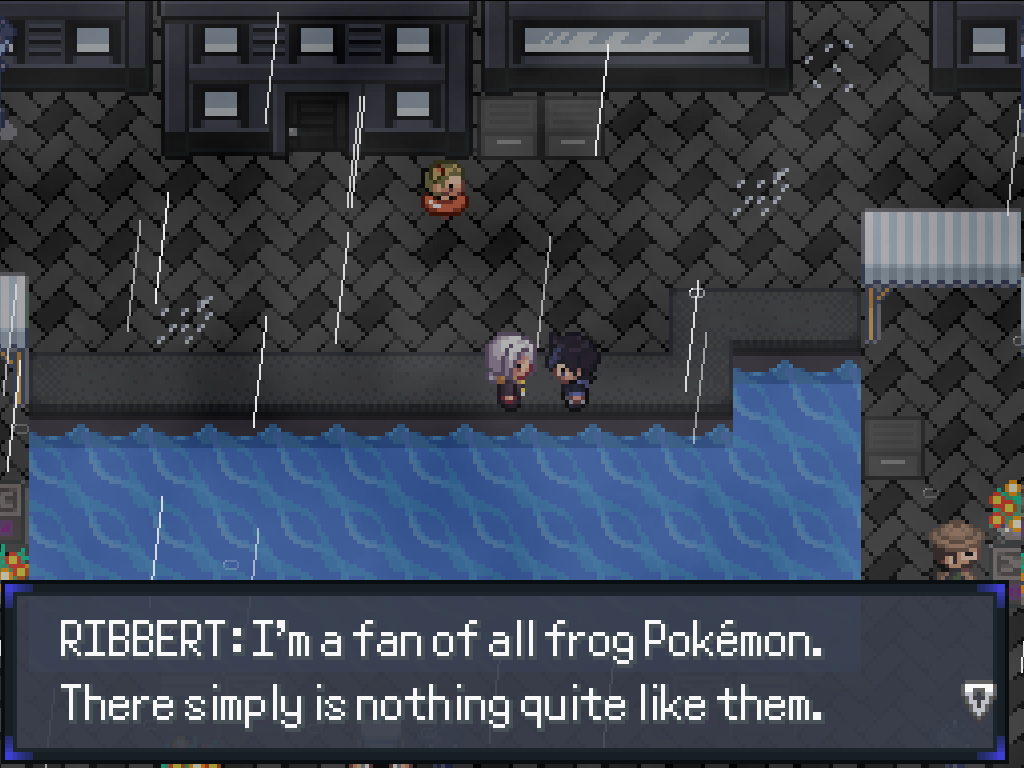 He fulfills a few roles. His first role is that he acts as the main sidequest giver, of course. Interacting with him and hearing his spiel about frog Pokemon begins the quest “Hop To It!”, which is the sidequest that lets you catch Tadbulb. This is also the 2nd role he fulfills: everything about Ribbert is designed to make you go “okay, I see why this guy knows about Tadbulb”. His character is, first and foremost, an explanation as to how you could find Tadbulb in-universe.