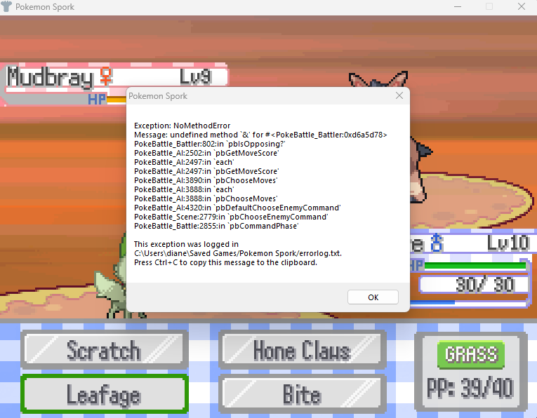 I am playing the latest version of Spork (The one released January 19 2026, I believe). This error happened. My Sprigatito is using Leafage while Mudbray's attack is not going through and this is happening. This is the battle with Tourist Patrick in Virima City. The bug does not stop the game from progressing, but I thought that I should report it anyway. Sprigatito has the Protean ability.
