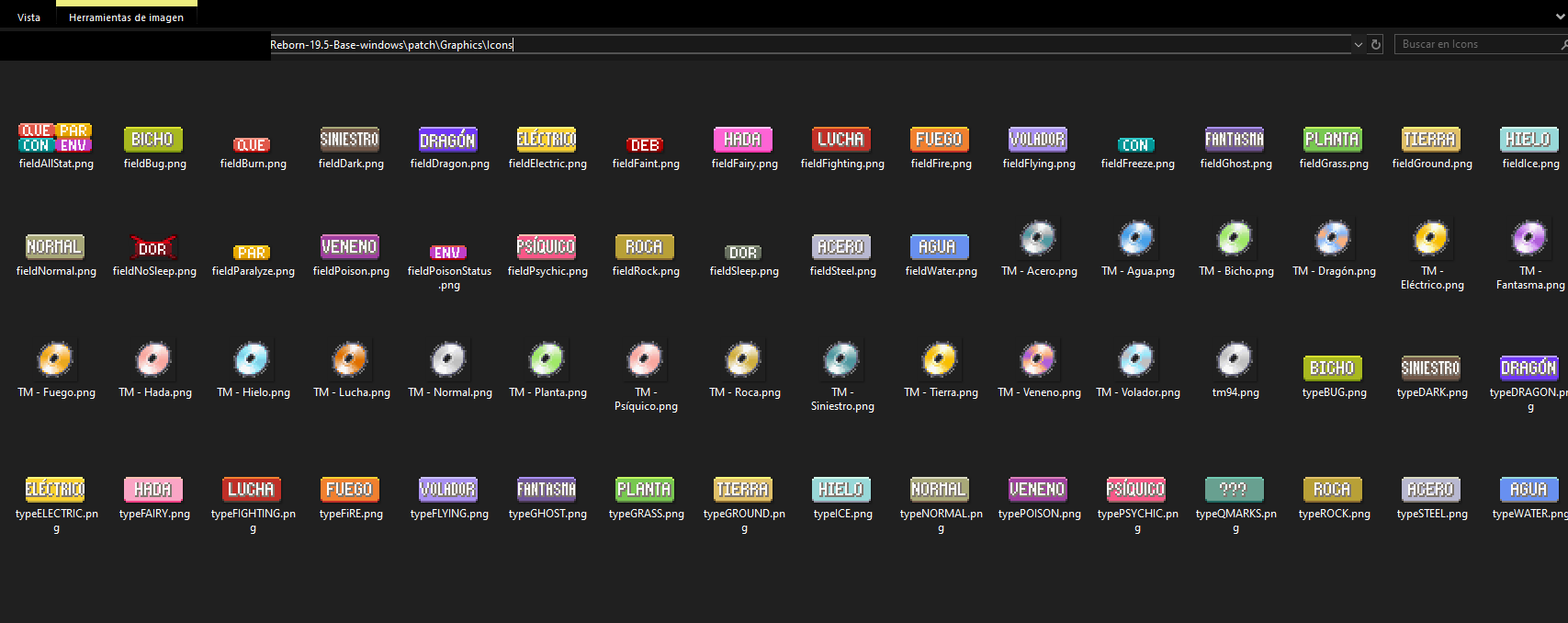 Sí, es un error que hay a la hora de traducir algunas imágenes. Se nos paso repararlo en esta nueva versión del mod. Para la próxima mini versión del mod, v0.8.5, se arreglará. Mientras tanto, sigue estas instrucciones con tu juego: En la carpeta del juego, en el mismo sitio donde está la aplicación (o el exe, como lo llames), hay una carpeta llamada "patch". Dentro de esta carpeta tiene que haber una carpeta llamada "Graphics", con una carpeta dentro de esta llamada "Icons". Por favor: No confundas esta carpeta con la carpeta "Graphics" que está AFUERA del patch. Tiene que ser la que está DENTRO. En esta se encuentran los iconos de la TM. Tienes que cambiar los nombres en inglés a español. Aquí te dejo una lista de los nombres en inglés por sus respectivos nombres en español. No te olvides de los acentos Normal Normal Fighting Lucha Flying Volador Poison Veneno Ground Tierra Rock Roca Bug Bicho Ghost Fantasma Steel Acero ??? ¿¿¿??? Fire Fuego Water Agua Grass Planta Electric Eléctrico Psychic Psíquico Ice Hielo Dragon Dragón Dark Siniestro Fairy Hada- 15 replies