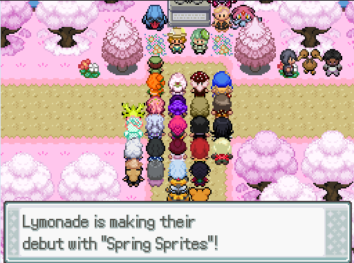 SPRING Since the Forest of Feeling has been completed for Enigma's map revamp project, I used the revamped version in Delicia's Return to Dreamland. I wanted Spring's announcement to be this not just because of the Lymonade performance but also to show the new Forest of Feeling. I'm not finished with the events on this map yet. I'm in the process of doing the interview, and I set the event placements for the performance. I'd also like to thank Solviera for making the candy Ampharos backsprite! In Spork, it doesn't have a backsprite since only Delicia has it and it isn't obtained by the player, but here Delicia is the player. The reason Delicia's Pokemon aren't nicknamed and her Ampharos is male in the screenshot while female in Spork is because I'm not sure how to specify nicknames, genders, etc. when giving the player Pokemon, and I also think the character limit on nicknames is shorter for the player than it is for other trainers. but canonically/through gameplay and story separation all of the nicknames still exist. (and the Volcarona isn't nicknamed because it doesn't belong to a trainer) Similar to how in DDDL there were a few maps that had a move relearner, in Delicia's Return to Dreamland every map where Delicia battles has a move relearner NPC along with an NPC who gives Delicia all the TMs her Pokemon can learn for free (this NPC disappears once you've gotten the TMs). edit: also