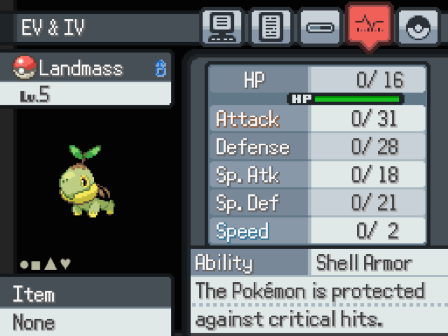 Hello People of Reborn City! My name is WSGreen, (you know, the one that comes on the forums on in a blue moon.) and I have been seeing a lot of monoruns popping up lately and thought, what the heck why not. So with out further ado, here is my Ground monotype run of Reborn! Chapter 1, Part 1: Introduction Lets Get things started with a introduction to are hero. This is Daisuke, age 18, Home region Kanto. And his starter for the he will be picking is.... Turtwig's ivs are all around decent (especially his attack and defense) and brave nature is really decent as well. I'll post more once im further into the game. There will be updates to the team down below for anyone curious.