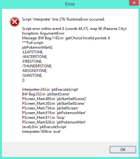 @Silent Chord So I've been meaning to play this for a while, I've had episode 1 downloaded for who knows how long, but now that episode 2 was released I thought 'huh...why haven't I played it yet?' anyways so far I love what you've done, the aesthetics are really beautiful, I've only beaten the first gym leader but still loving it. So there's a really game breaking bug, I bought a water stone from the vendor in the second city to evolve my shiny eevee, but I can't access my bag anymore, I tried all different tricks to get to it; can't open it from the menu, can't give a pokemon an item, and I can't sell anything. The following pops up when I try: Please help, I'd really love to continue playing this game Game.rxdata Edit: I've found the problem, the game wasn't registering the chocolate smoothie I bought in the mart, and I've fixed the issue by reverting back to episode one to get rid of it and then coming back to episode 2. I wish you could fix this for future versions because those types of items are really interesting.