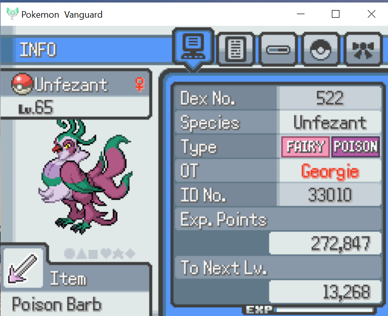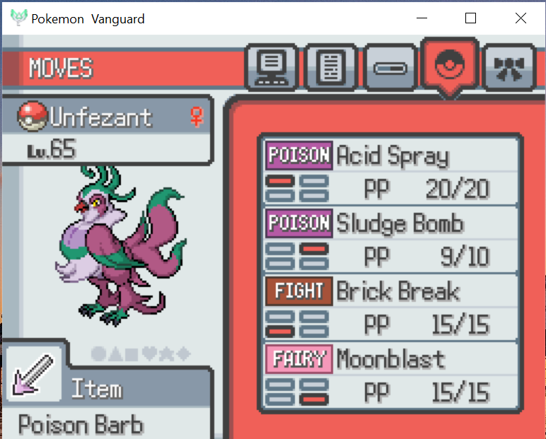 Unfezant The Vanity Pokemon Gender: Female Prior Form: Tranquil Method of Evolution - Level up female Tranquil up to Level 32 Current Level: 65 Type: Fairy/Poison H/W: 1.4m/59kg Ability: Hypervanity F - The user's Sp.Atk/Sp.Def is raised/lowered by 1 when it switches in. In the past, the commanding presence of Unfezant was enough to make entire civilisations bow to it. Those that stood in its way were showered by powerful toxins. She has been an incredible help against Fairy, Dragon, and Grass-type opponents. Unfezant also has a fighting-type move for coverage against Steel and Ice-type Pokémon. Held Item: Poison Barb - Boosts the power of the holder's Poison-type moves by 20%. Moveset: Acid Spray, Sludge Bomb, Brick Break, Moonblast Signature Move Sludge Bomb Type: Poison Power: 90 Category: Special PP: 10 Accuracy: 100 The user hurls unsanitary sludge at the target. This move has a 30% chance of poisoning the target.