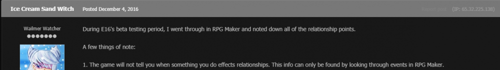 During E16's beta testing period, I went through in RPG Maker and noted down all of the relationship points. A few things of note: 1. The game will not tell you when something