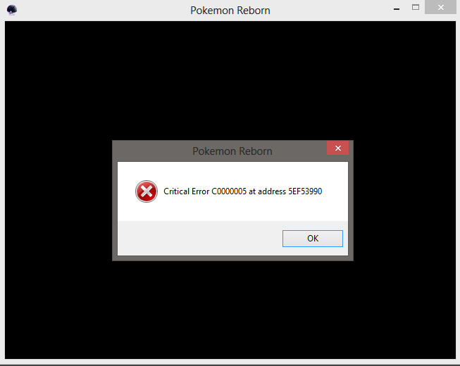 tomato-dragon 0 Posted August 21, 2017 Share Posted August 21, 2017 Greetings, I am new to this game and this forum, I hope I'm posting this in the correct forum. I downloaded Pokemon Reborn v16.2, extracted it, run it. It was working initially until at some point after I battled one guy near the dirty river that has a Snivy (the crash happened not during the battle but sometime after it), when it crashed with the message in the title (Critical Error C0000005 at address 5EF53990). I tried running it again but it simply crashed immediately (see screenshot). I deleted the whole game folder, then re-extracted the folder from the original downloaded file, did not work. I deleted my save folder, did not work. I restarted the computer, also did not work. Desperate measures: emptied the recycle bin, re-downloaded the game, did not work. I basically have a clean slate because I deleted everything before extracting the new game folder. I'm wondering whether there is some other files or folders being generated beside the game and save folder? Following the guidelines here, in case it needs to be explicitly stated, I did not use any mods or did any online battle. Link to post Share on other sites
