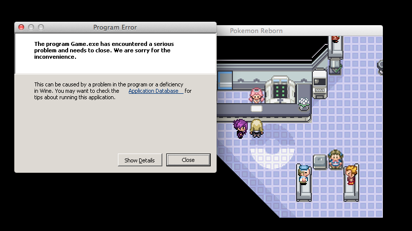 shulan33 0 Posted June 20, 2013 Share Posted June 20, 2013 Hi, I just downloaded this game and was really excited to play. I just downloaded the application Wine, as well, which lets mac users play pc games (which I only found out about because it was recommended). The game worked perfectly for me until after the first battle with Cain. The error message comes up right after nurse joy asks if I want to heal my pokemon. Basically what pops up is a window with the title "Program Error" saying "The program Game.exe has encountered a serious problem and needs to close. We are sorry for the inconvenience." then goes on to say: "This can be caused by a problem in the program or a deficiency in Wine. You may want to check the [Application Database] for tips about running this application." which I did, and wasn't helpful... so I'm confused on what to do I replayed the game to that point about 3 times now and am not sure if it is the Wine program, the game or it being on a mac and I don't know how to fix the bug. (I added a screenshot just in case that would help) Any advice/help would be greatly appreciated. The game looks awesome and I really want to play it so hopefully I can figure this out. Thanks for your time~! Link to post Share on other sites