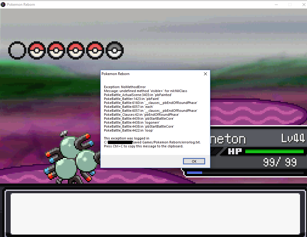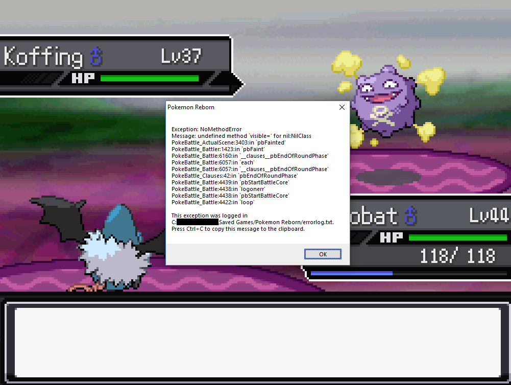 BIGJRA 133 Posted August 10, 2018 Share Posted August 10, 2018 Hi, seconding that this was happening while I was grinding for Defense EV's in the wasteland. Here's my errorlog for this: Exception: NoMethodError Message: undefined method `visible=' for nil:NilClass PokeBattle_ActualScene:3403:in `pbFainted' PokeBattle_Battler:1423:in `pbFaint' PokeBattle_Battle:6160:in `__clauses__pbEndOfRoundPhase' PokeBattle_Battle:6057:in `each' PokeBattle_Battle:6057:in `__clauses__pbEndOfRoundPhase' PokeBattle_Clauses:42:in `pbEndOfRoundPhase' PokeBattle_Battle:4439:in `pbStartBattleCore' PokeBattle_Battle:4438:in `logonerr' PokeBattle_Battle:4438:in `pbStartBattleCore' PokeBattle_Battle:4422:in `loop' EDIT: Might be helpful to know this was NOT happening in Beta, but now is in community. Link to post Share on other sites