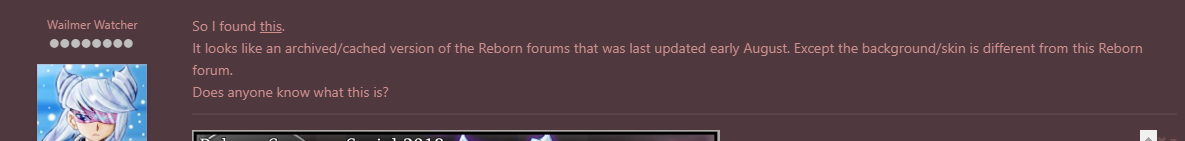 Global Mods Ice Cream Sand Witch 1650 Posted December 29, 2018 Global Mods Share Posted December 29, 2018 It's been 2 years so I think I can mention this now. Background info for those who weren't around back then: the forums were updated in late 2016, and it was then we started to be Rebornevo. I found the Rebornevo site a couple months before it was public. I was looking for an old thread and google results took me there. I posted in Site Inquiries asking if anyone knew what it was, and Ame saw the thread and hid it because it wasn't supposed to be public knowledge yet. Link to post Share on other sites
