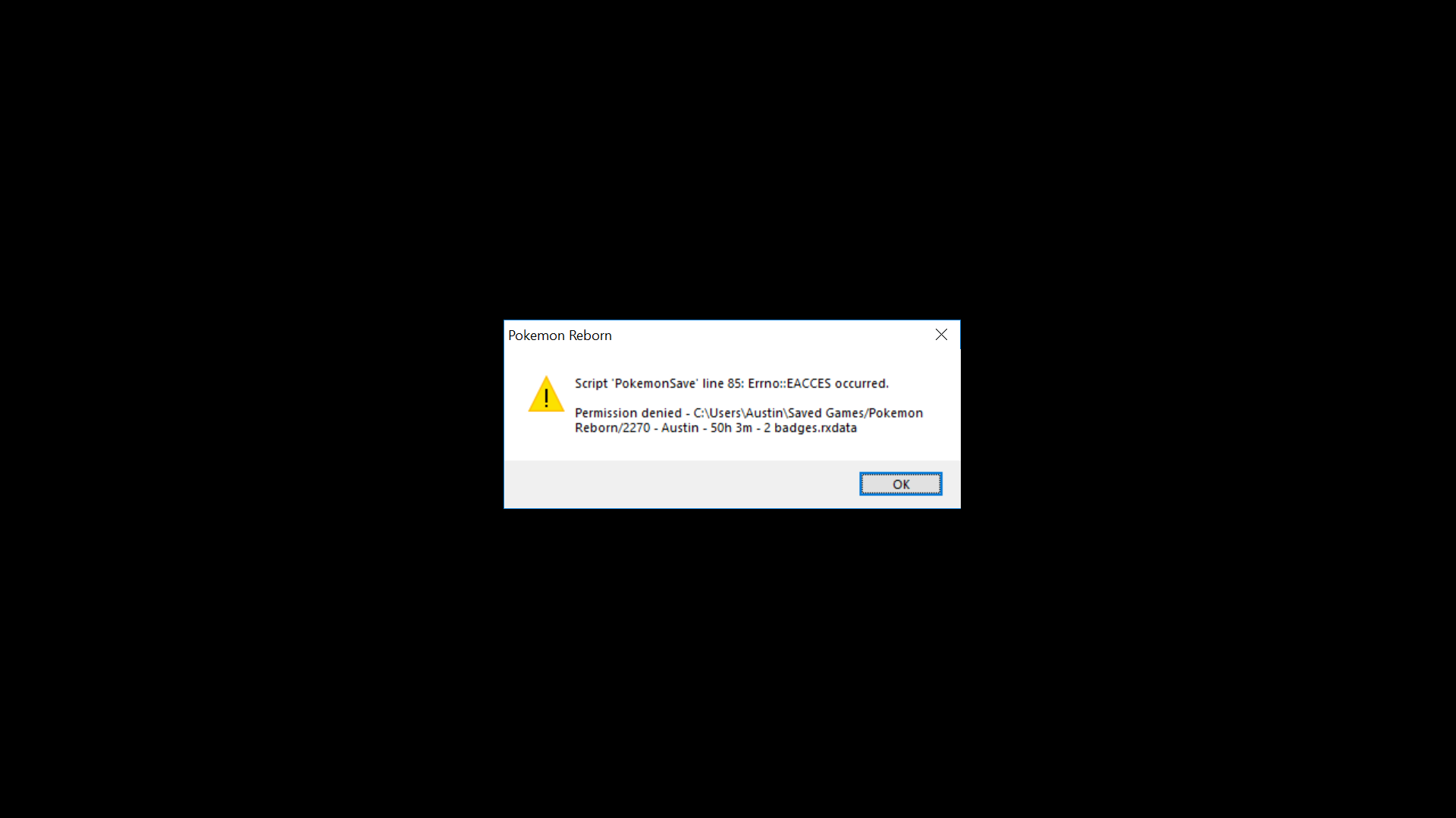 Shaderu 19 Posted August 9, 2019 Share Posted August 9, 2019 Hello everyone. As the title says, I started a new save game on my desktop PC, and just tried to transfer it over to my laptop, so I can grind and such. However, upon attempting to save, I get the following error: This didn't happen in my last playthrough, and I am at a loss as to how to correct the issue. Any help is much appreciated! For reference, here's the save file in question: Game.rxdata Game.rxdata Link to post Share on other sites