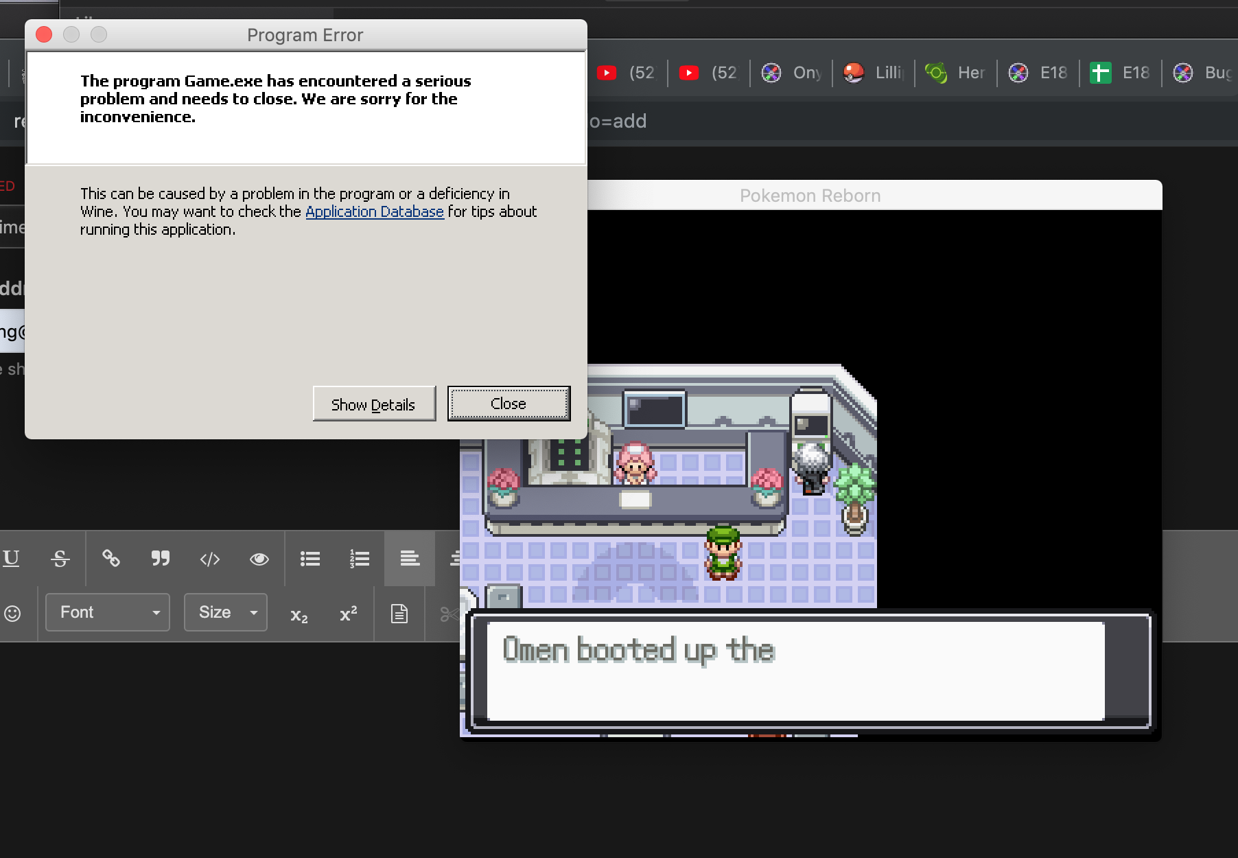 maywhales 0 Posted October 8, 2019 Share Posted October 8, 2019 Been really enjoying this game. I play Reborn on my Mac, and I used the Wineskin method to play it. Everything is ok apart from some lag, but whenever I try to open my PC in game the game crashes. Not sure how to fix this. I've attached a photo of the prompt. Could anyone help me out? Link to post Share on other sites
