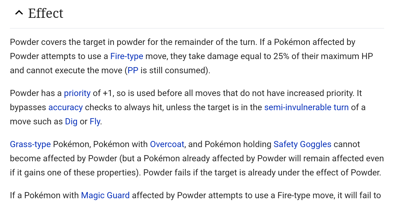 Staff Aeodyn 18 Posted November 11 Staff Share Posted November 11 Here's a fix, it can just be dropped in the `Data\Mods` folder. (Only briefly tested however.) The cause: Line 4962 in PokeBattle_Battler, instead of `@battle.pbCommonAnimation("Powder",pbThis,nil)` it should be `@battle.pbCommonAnimation("Powder",self,nil)`. Powder fix.rb Quote Link to post Share on other sites