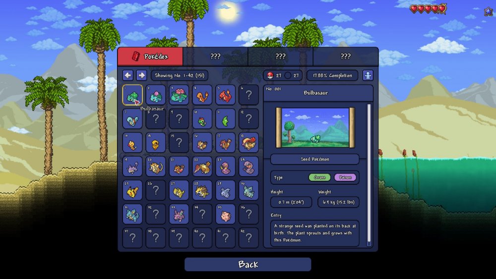 Michaelsoftman Posted February 28, 2025 Share Posted February 28, 2025 If you enjoy both Terraria and Pokémon, the Terramon Mod is the perfect crossover! Catch, train, and explore alongside your favorite Pokémon in an experience that blends the best of both worlds. Terramon has just been released as an initial Beta version and is available on the steam workshop for free. Download - Steam Workshop Terramon Homepage - Homepage Discord Server - Discord FEATURES • 150+ Pokémon to find and catch, including their Shiny forms • Several different Poké Balls with interactive mechanics • A brand new Town NPC, the Poké Mart Clerk • Custom user interface (UI) elements designed to match Terraria’s vanilla style • Vanity and other decorative items Terramon is still actively in development and is planning more features, including a retro style battle system. If you'd like to help out with the project, especially in regards to pixel art and animation, please join the discord! Screenshots: Quote Link to comment Share on other sites More sharing options...