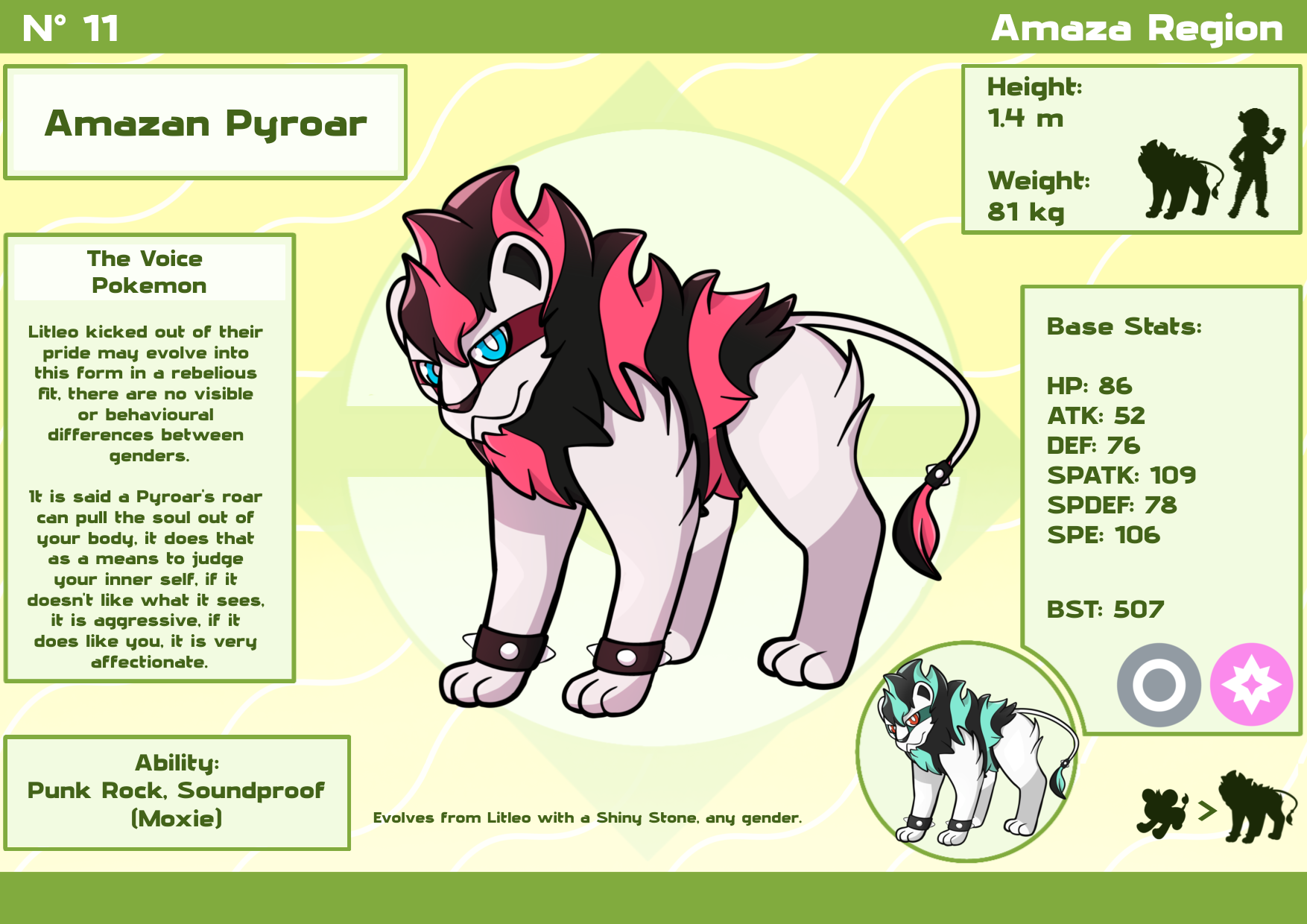 Cylland Posted October 21 Share Posted October 21 Hello! I like drawing fakemon, so I decided to import some of my children as playable pokemon fro, the Amaza Region based on Brazil into Reborn! Amazan Incineroar, the strongman pokemon is a circus performer that loves to show off how strong it is by lifting heavy objects and being helping the weak. Amazan Pyroar, the voice pokemon, its roars are powerful yet beatutiful melodies to fend off foes and soothe friends. Evolves with a Shiny Stone. Punk Rock does not exist in Reborn. I can't port this mod into Rejuvenation by myself but feel free to copy my code and compile it into Rejuvenation, just make sure to change the dex numbers. The pokemon are standalone versioms to prevent bugs so you will need to give yourself them via passwords like anystarter or debug INSTALATION Simply drag and drop the folders into your reborn folder and overwrite when prompred (Please make a backup of your game files and save files beforehand.) Hope you enjoy! Amaza Region Fairy Types Mod.zip Quote Link to comment Share on other sites More sharing options...